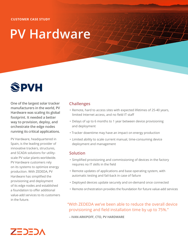 PV Hardware, a leading solar tracker manufacturer, faced a major challenge: deploying and managing critical edge nodes at remote sites with no on-site IT staff. By partnering with ZEDEDA, they transformed their operations, simplifying device provisioning by 75% and enabling remote management and updates. ZEDEDA’s platform provided a scalable, future-proofed foundation that not only reduced manual effort and cost but also gave them the peace of mind that their systems are always secure and functional, even in the most challenging environments.