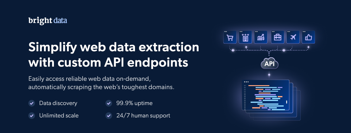 Bright Data simplifies web data extraction with custom scraper API endpoints that deliver structured, reliable data on-demand. Automatically scrape even the toughest websites at scale — without worrying about proxies, CAPTCHAs, or maintenance. With built-in data discovery, parsing, and validation, teams can focus on insights instead of infrastructure, supported by 24/7 global experts and unmatched uptime.