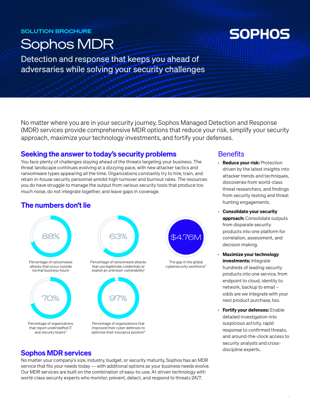 Sophos Managed Detection and Response (MDR) offers a comprehensive cybersecurity solution designed to address modern threats with AI-driven technology and 24/7 expert monitoring. The service helps organizations overcome challenges like evolving attack tactics, talent shortages, and tool sprawl by consolidating security operations, integrating 350+ third-party products, and providing proactive threat hunting. Key benefits include reduced risk, optimized technology investments, and rapid incident response—ensuring businesses stay protected against ransomware, credential theft, and other advanced threats.