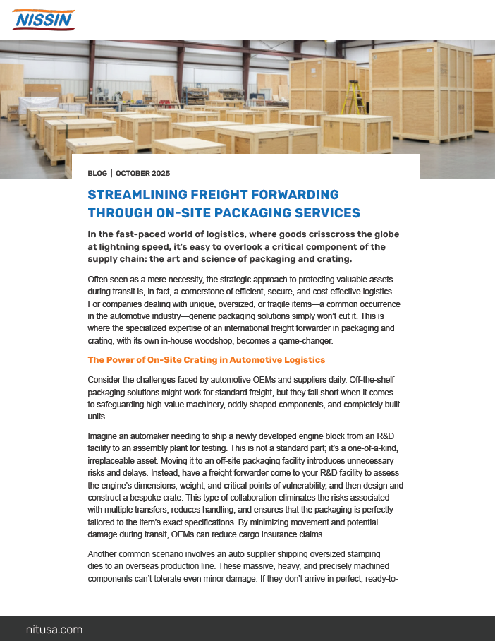 Packaging and crating are critical yet often overlooked components of efficient freight forwarding, especially for automotive OEMs and suppliers managing oversized, fragile, or high-value components. On-site packaging services enable logistics providers to assess cargo directly at your facility and design custom crates that minimize handling, reduce transit risk, and protect assets throughout the journey. By integrating packaging expertise and in-house woodshop capabilities, businesses can improve supply chain efficiency, reduce damage, and avoid costly production delays.
