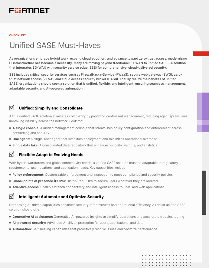 SSE includes critical security services such as Firewall-as-a-Service (FWaaS), secure web gateway (SWG), zero trust network access (ZTNA), and cloud access security broker (CASB). To fully realize the benefits of unified SASE, organizations should seek a solution that is unified, flexible, and intelligent, ensuring seamless management, adaptable security, and AI-powered automation.