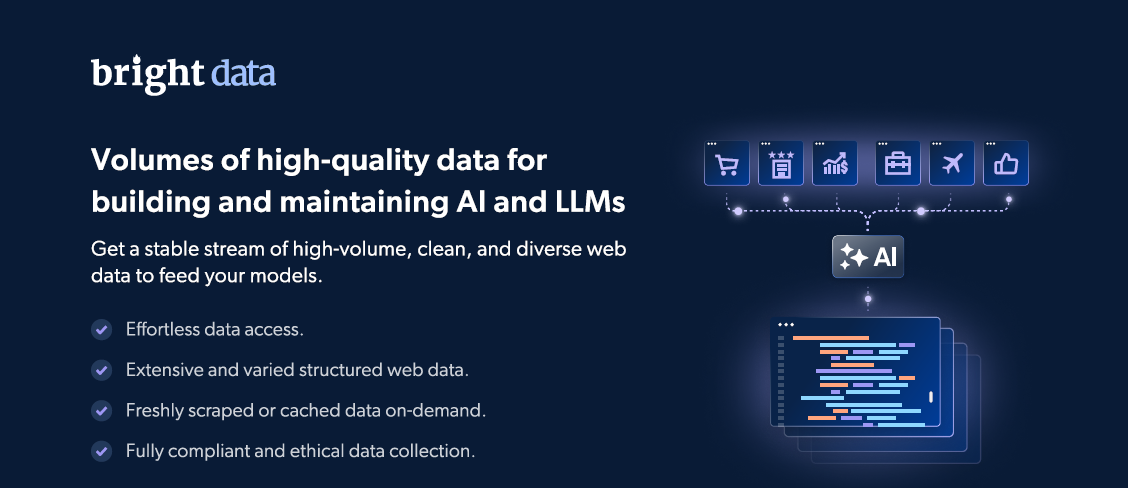 Bright Data provides high-volume, high-quality web data to power the development and performance of AI models and LLMs. With effortless access to structured, diverse, and freshly scraped or cached data, organisations can build reliable pipelines and scale insights without the burden of managing infrastructure. Bright Data ensures fully compliant, ethical data collection and supports seamless delivery into any workflow — helping teams accelerate innovation with confidence.
