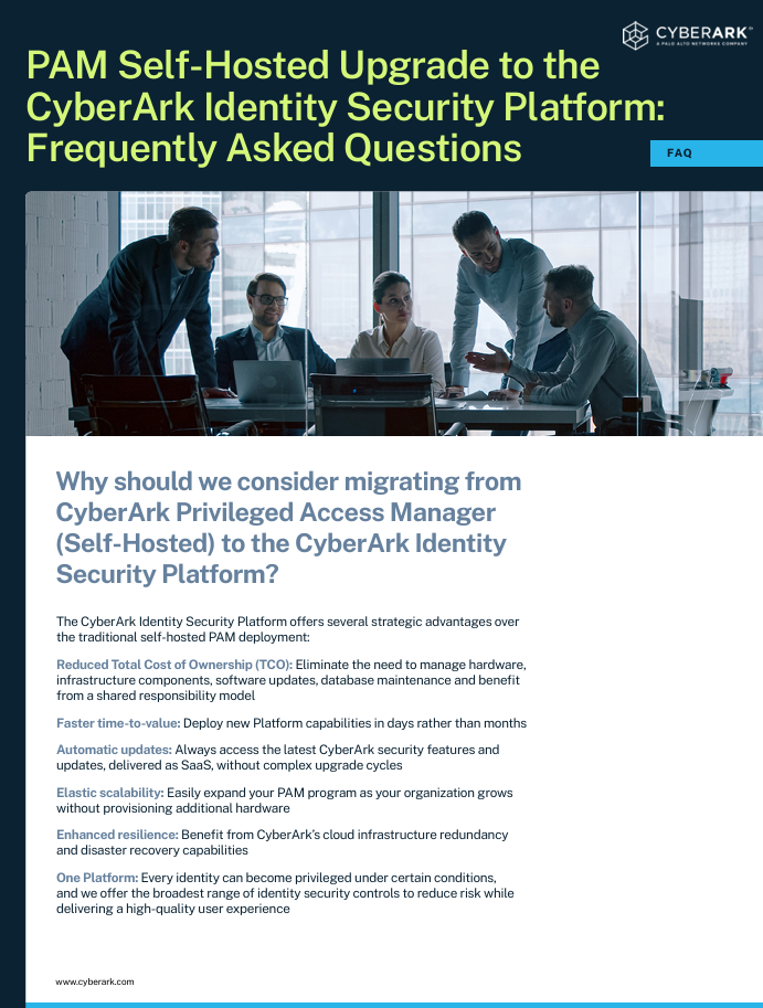 Migrating from a self-hosted PAM deployment to CyberArk PAM SaaS unlocks lower TCO, faster time-to-value, automatic updates, elastic scalability, and stronger security backed by SOC 2 Type 2 compliance. This FAQ breaks down what the transition looks like, how it improves your resilience, and why organizations modernizing cloud and identity programs are accelerating their move to the CyberArk Identity Security Platform.
